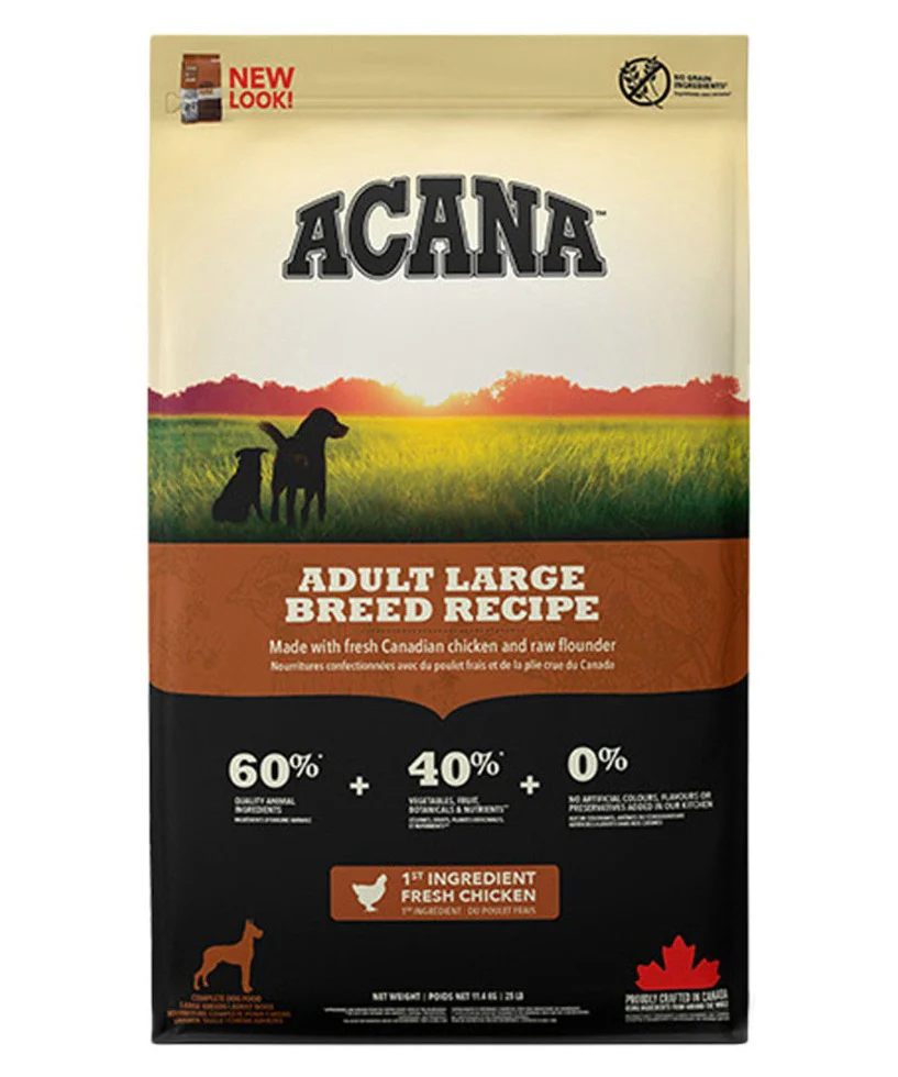 Perfect for larger dogs, ACANA™ Adult Large Breed supports healthy weight and joint health with a protein-rich formula that promotes lean muscle and reduces stress on bones and joints. This carefully crafted recipe features 60% quality animal ingredients, including fresh free-run chicken and raw wild-caught hake, for the protein your dog needs to stay strong and active. Balanced with 40% fresh fruits and vegetables like whole pumpkin, apples, and leafy greens, ACANA provides premium nutrition to support your large breed dog’s health, mobility, and overall vitality.